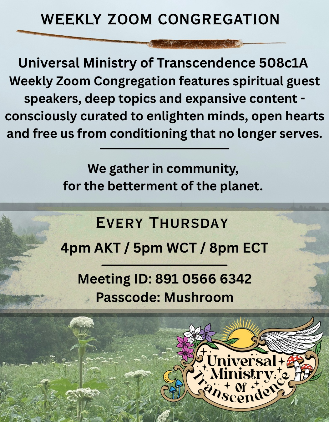 Our current weekly congregation is on ZOOM Thursdays at 4pm Alaska Time (5pm WCT, 9pm ECT) featuring spiritual guest speakers, herbal healing discussions and other interesting content around deprogramming the mind and spirit, inner growth and self-healing each week. Registered members of our 508c1a Free Church as well as non-members are invited to attend. Sign up to become a member and receive invitations to upcoming mushroom ceremonies, live events and entheogenic newsletters. Donations are welcome.